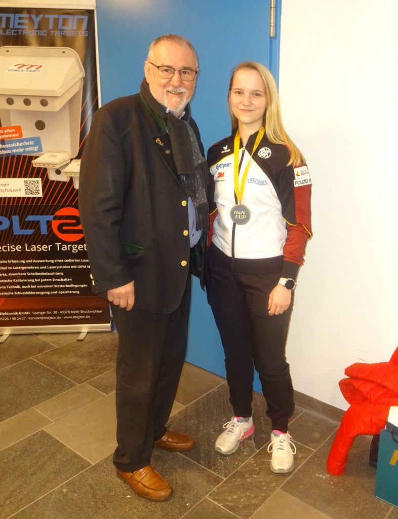 Präsident Roland H. Wittmer, der als Zuschauer beim H&N Cup in München Vorort war, gratulierte Larissa Weindorf und sprach Glückwünsche im Namen des Badischen Sportschützenverbandes zu dieser herausragenden Leistung aus.